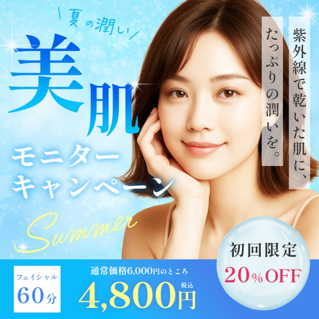 夏の紫外線による乾燥対策をテーマにしたエステサロンのキャンペーンバナーを制作しました。清潔感と透明感を意識し、ブルーを基調に爽やかな雰囲気を演出。